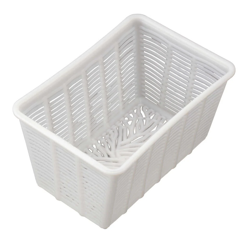 This rectangular basket cheese mold can be used to drain a variety of soft and semi-soft fresh cheese, including farmers cheese, ricotta, ricotta salata and feta. The detailed patter makes a unique and beautiful finished cheese. 1 lb | 3 1/2″ Tapered to 2 1/2″ W x 5″ Tapered to 4″ L x 3″ H. Made in Italy from food grade polypropylene