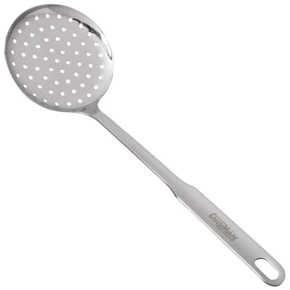 This stainless steel skimmer is a staple for all cheese makers. The slotted design lets whey drain from the curds, as they are scooped out of the pot, and placed into draining cloth or cheese molds. This skimmer can also be used to mix ingredients into milk and stir curds while heating.